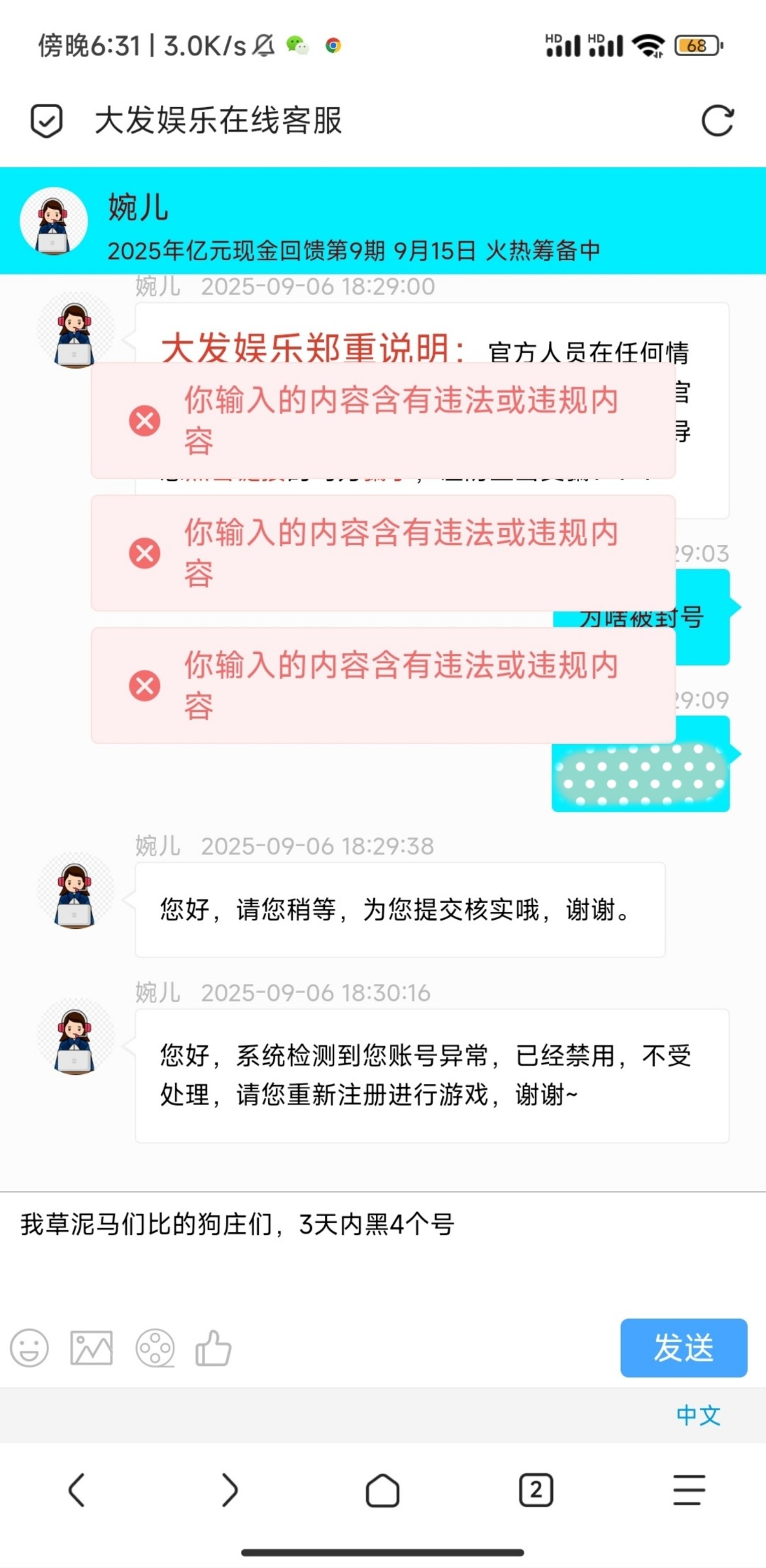 无聊刷精彩系,上号看到余额有5,拉pg给了80,本来想下,怕他又说活跃度低不给,然后就充了10块,打到100提了,结果依旧黑,而且我还是v2,玩了很多精彩系,第1次被精彩系黑,除了几年前那个必赢亚161,注册23彩金上5000黑了之外,充过的葡京662,皇冠227,永利60,bet1056,太阳2018,和前天的金沙990最多就是让我多打流水就可以出了,而且还是抢的红包,这个b大发989真的是精彩系的耻辱