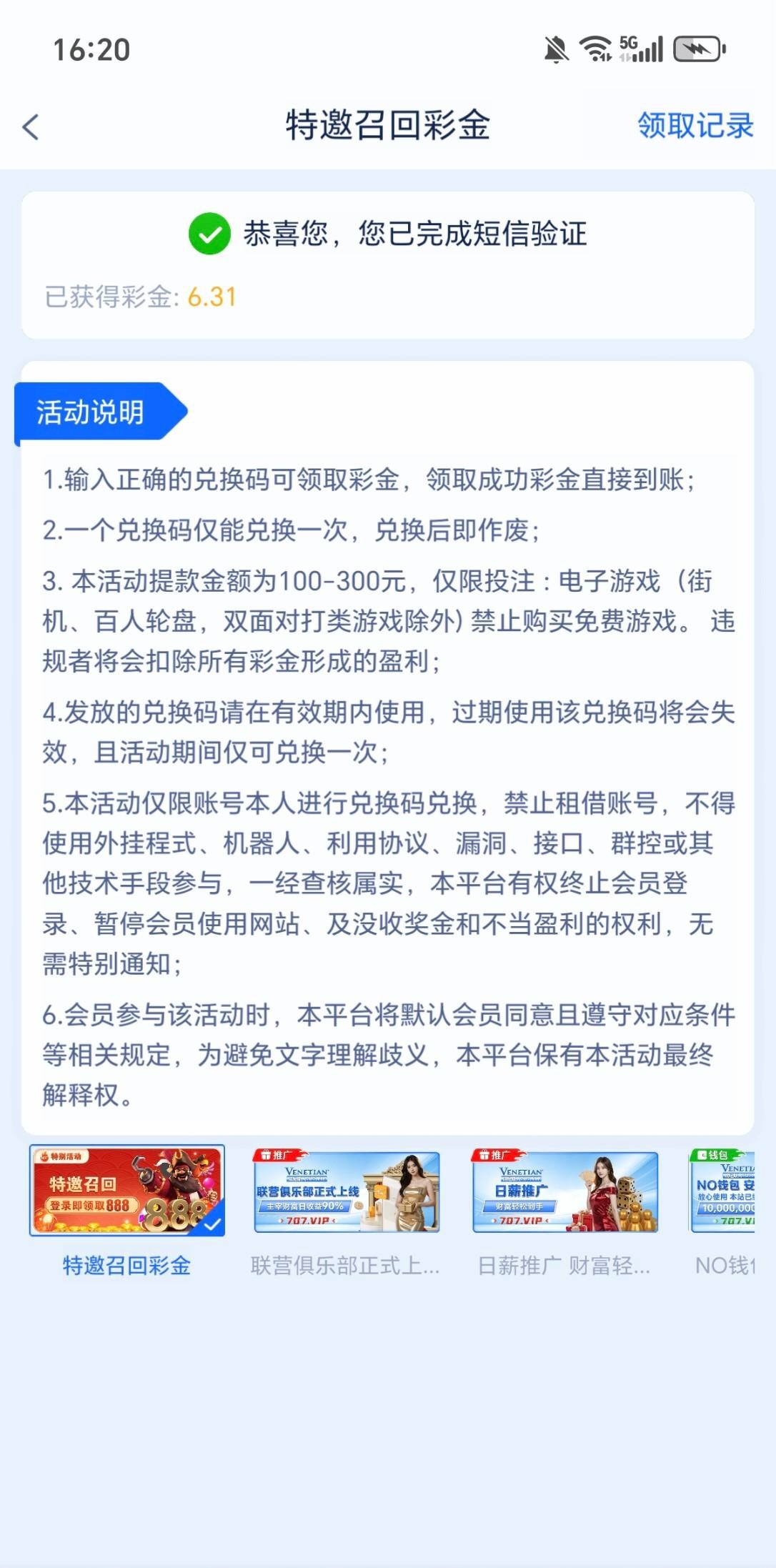 【威尼斯707】回归彩金