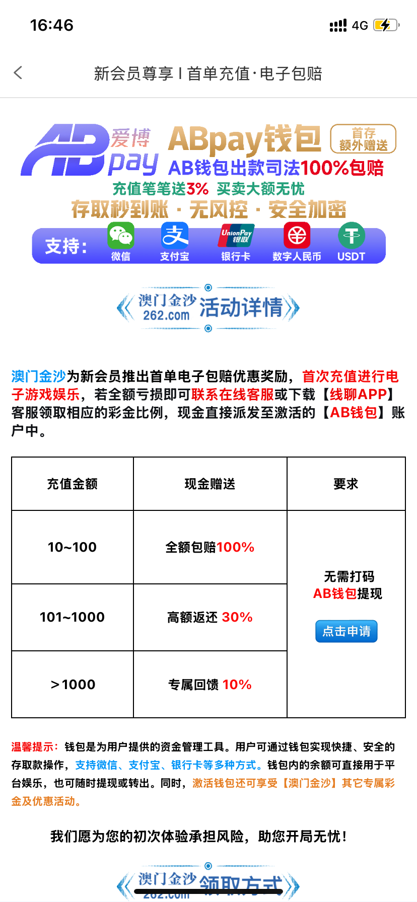 续前两天老哥发的262  10+18没赶上,今天发现充值100后优惠有首单包赔的活动而且是直接赔100abpay的币可以直接卖掉