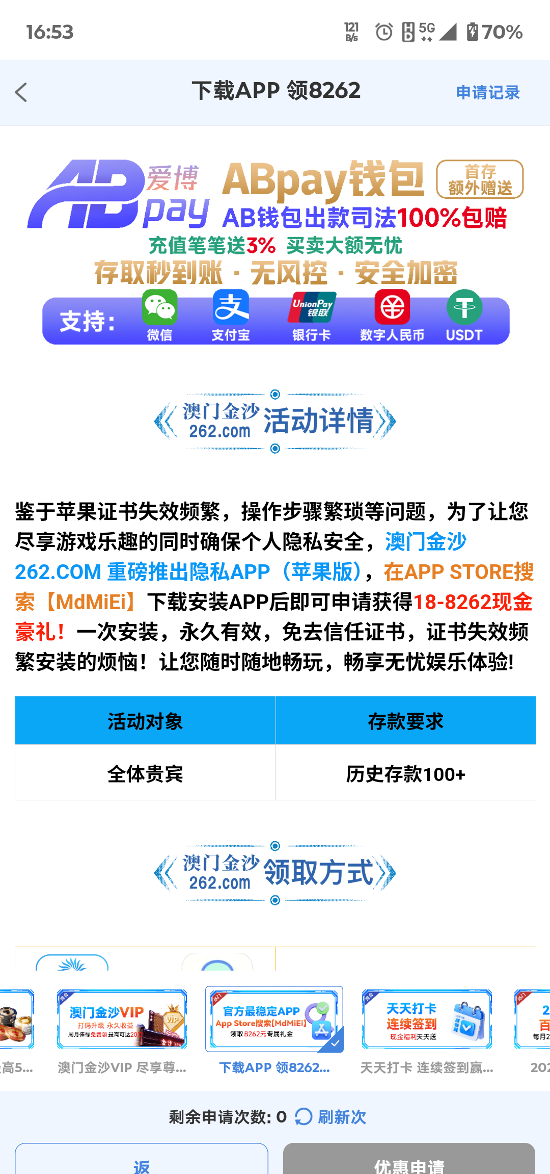 我一开始是安卓手机玩的,看到这个活动就用苹果下载APP登录申请了,没想到给了这么多,不知道是运气还是什么,老哥们可以试试,一定要要活动要求,历史存款100+