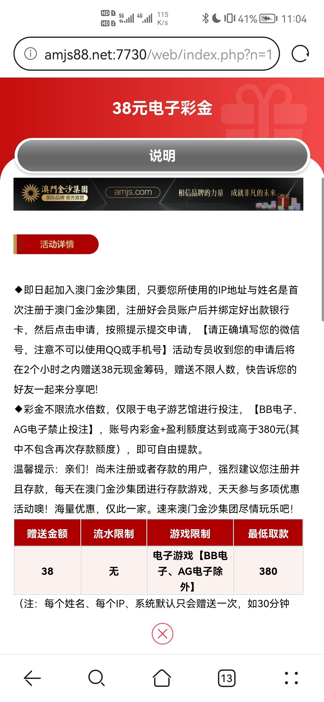 注册好会员账户后并绑定好出款银行卡,然后点击申请,按照提示提交申请,【请正确填写您的微信号,注意不可以使用QQ或手机号】活动专员收到您的申请后将在2个小时之内赠送38元现金筹码,赠送不限人数,