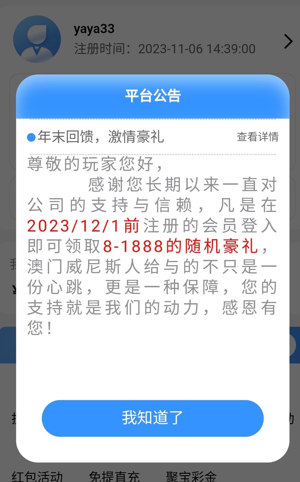 老用户专属活动,12月1号前注册的用户无需充值登录账号,自动有弹窗红包,出款自测!