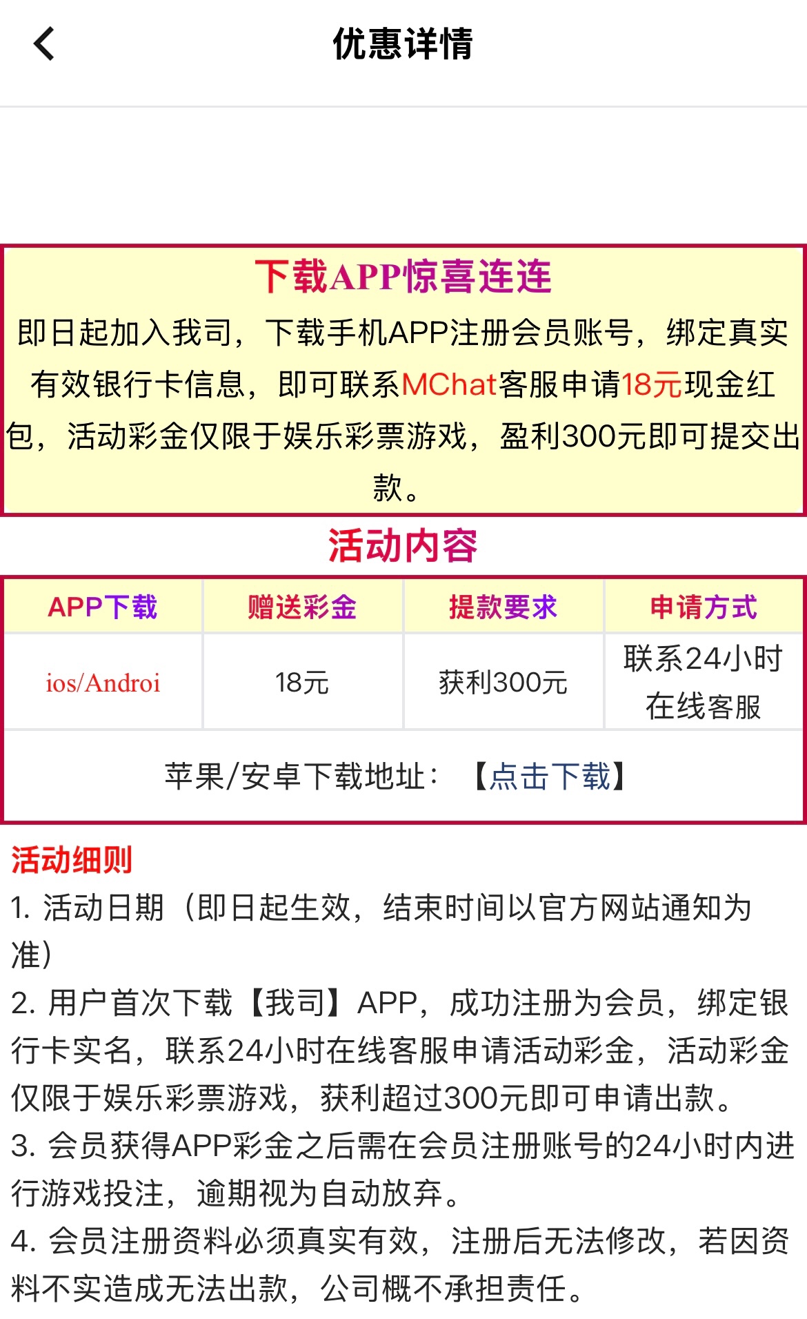 新用户注册完善个人信息下载平台APP联系MChat客服领取18彩金 满300提现