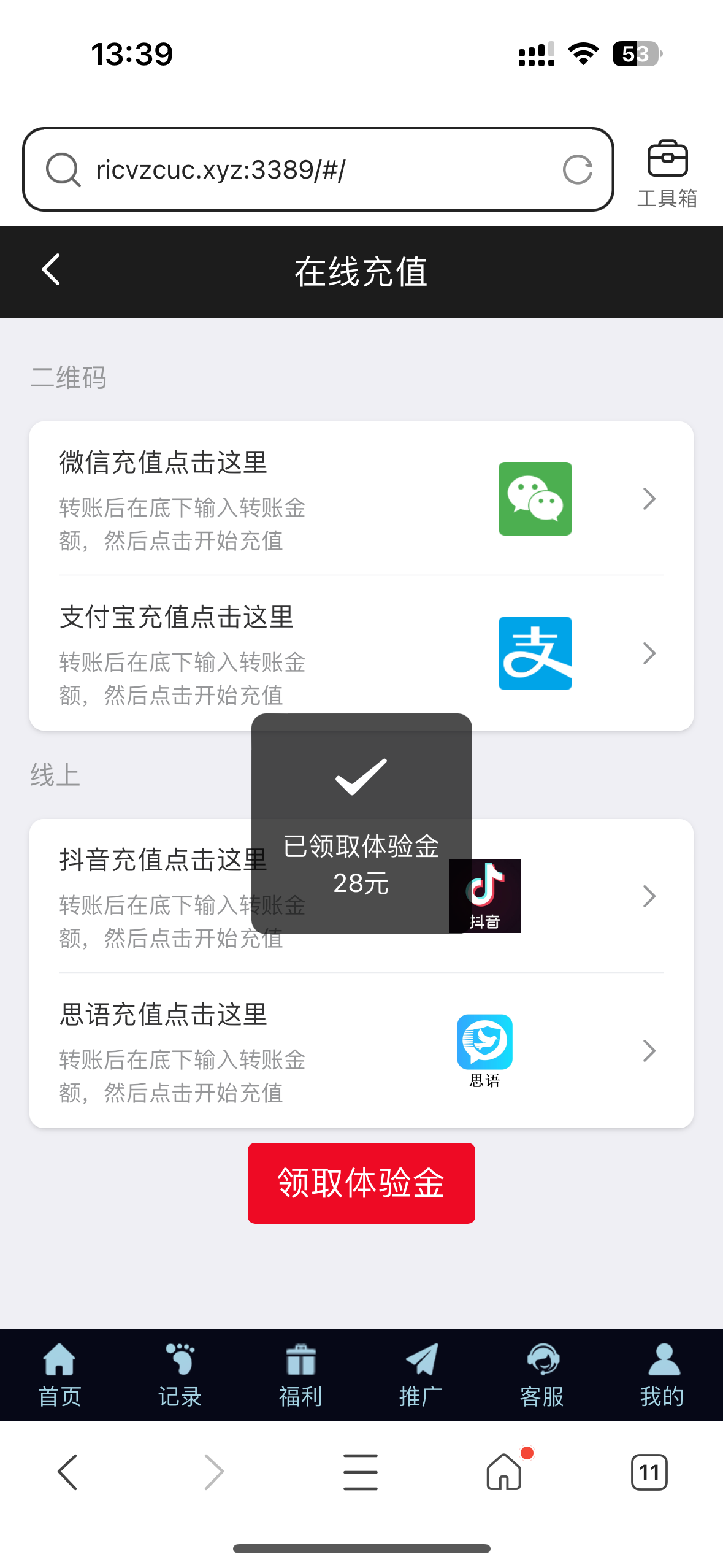 登陆直接点击充值领取28秒到账