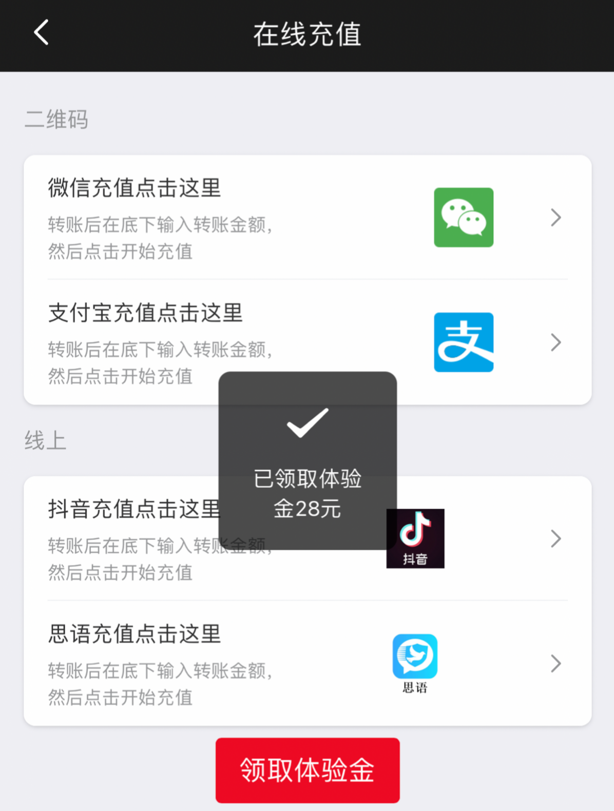 登陆后(点击充值)下方有体验金领取即可!